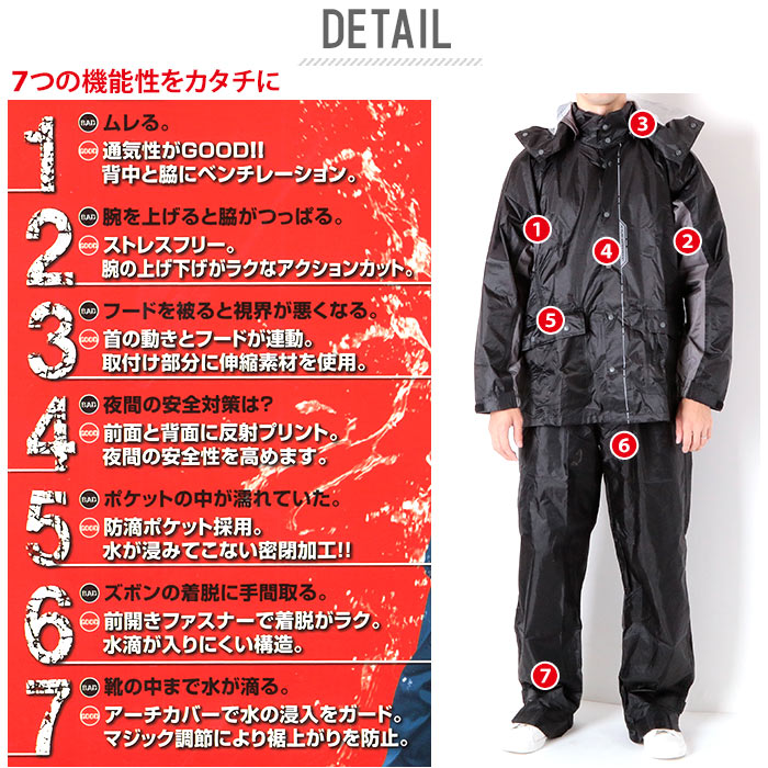 今までの当たり前を見直し、7つの機能性をカタチにした、7ポイント耐久防水レインスーツ。