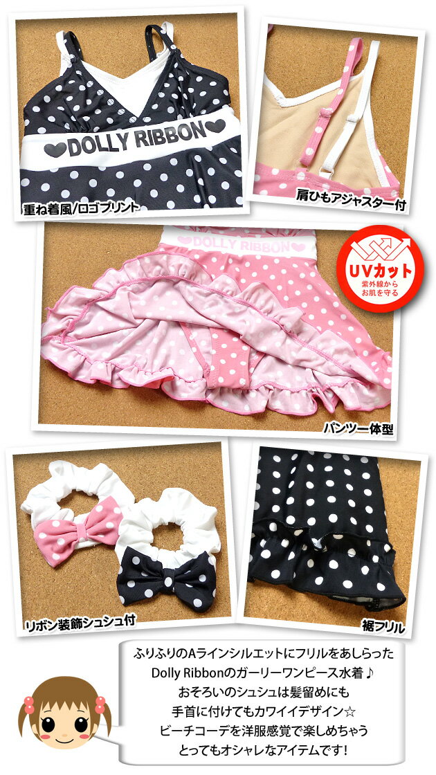【特 長】 ・Dolly Ribbon/ドーリーリボン ・ワンピース水着 ・UV/紫外線カット ・パンツ一体型 ・リボンシュシュ付 ・ドット柄 ・胸元二重/重ね着風 ・肩ひもアジャスター付 ・ロゴプリント ・フリル ・子供用 ・女の子 【素 材】 ・(本体)ナイロン80% ポリウレタン20% ・(裏地)ポリエステル100% 【サイズ】 身長 体重 【90cm】 90cm 13kg 【95cm】 95cm 14kg (単位:cm/kg) 個体によっての若干の誤差はご了承くださいませ。