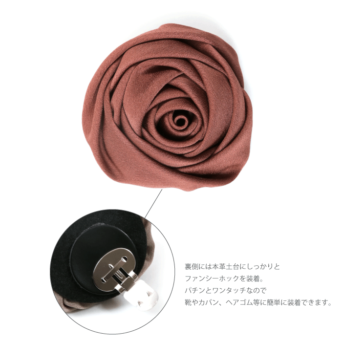 いつもの装いに手軽にプラスできる品質の良い日本製シューズアクセサリー シューズはもちろん バックやヘアアクセサリー、色々なアレンジが楽しめます。